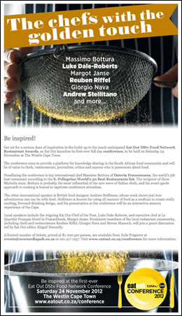 Speakers at this inspiring, informative and interactive event include top international chef Massimo Bottura; Bruce Palling (Wall Street Journal critic, World’s 50 Best Restaurants judge, blogger and Eat Out 2012 judge); and British food designer Andrew Stellitano. The conference aims to provide a platform for knowledge sharing in the South African food community and will be of value to chefs, restaurateurs, journalists, critics and anyone who is passionate about food.